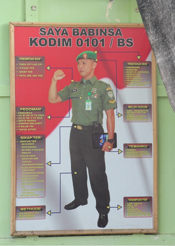 Sitting in a small coffee shop in Gampong Geudumbak, he continues: ‘I help them at all stages, from identifying land to cultivation to harvesting. Under my supervision, within just a year, my village has already opened 150 hectares of soybean and corn fields.’ Asked why the TNI, and not civilians, needs to supervise these activities, the Babinsa’s attitude is revealing. ‘You know’, he says, ‘Acehnese are lazy. They would rather hangout in a coffee shop every morning than work in the fields. So forcing them to work in the field is for their own good. The TNI is like a parent, and we need to educate our kids [the people].’