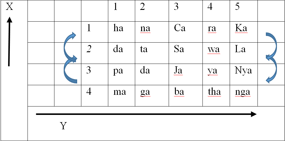 Walikan words are created by exchanging letters located in similar places in the sequences of the horizontal axes, as indicated by the arrows. Letters are only exchanged within the vertical axes. Thus, for example, the rap group Rotra, one of the oldest Javanese hip hop groups, chose its name by transliterating the word Yogya by using ‘ra’ (line 1, column 4) in place of ‘ya’ (line 3, column 4) and ‘t’ or ‘ta’ (line 2, column 2) in place of ‘g’ or ’ga’ (line 4 column 2)). Another example is gapi, which means tahi (faeces): ‘ga’ (4:2) replaces ‘ta’ (2:2) and ‘pi’ (3:1) replaces ‘hi’ (1:1).